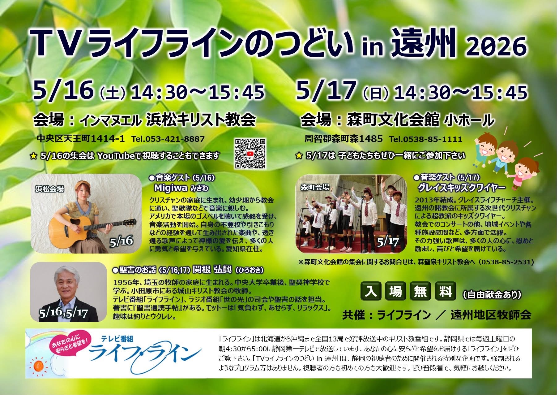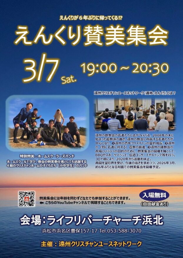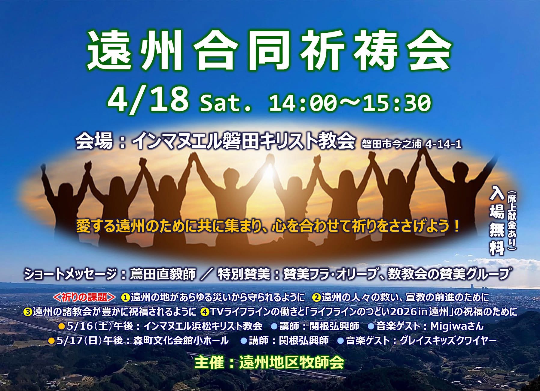 3/7「えんくり賛美集会」4/18「遠州合同祈祷会」5/16,17「TVライフラインのつどいin遠州」のお知らせ (^^)2026年03月03日